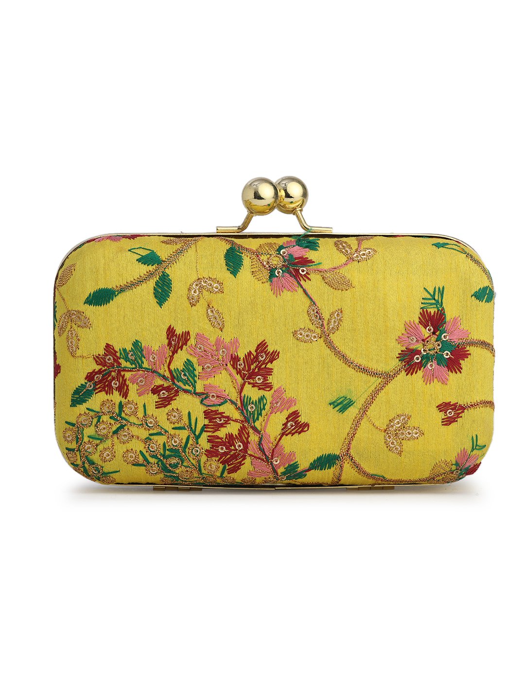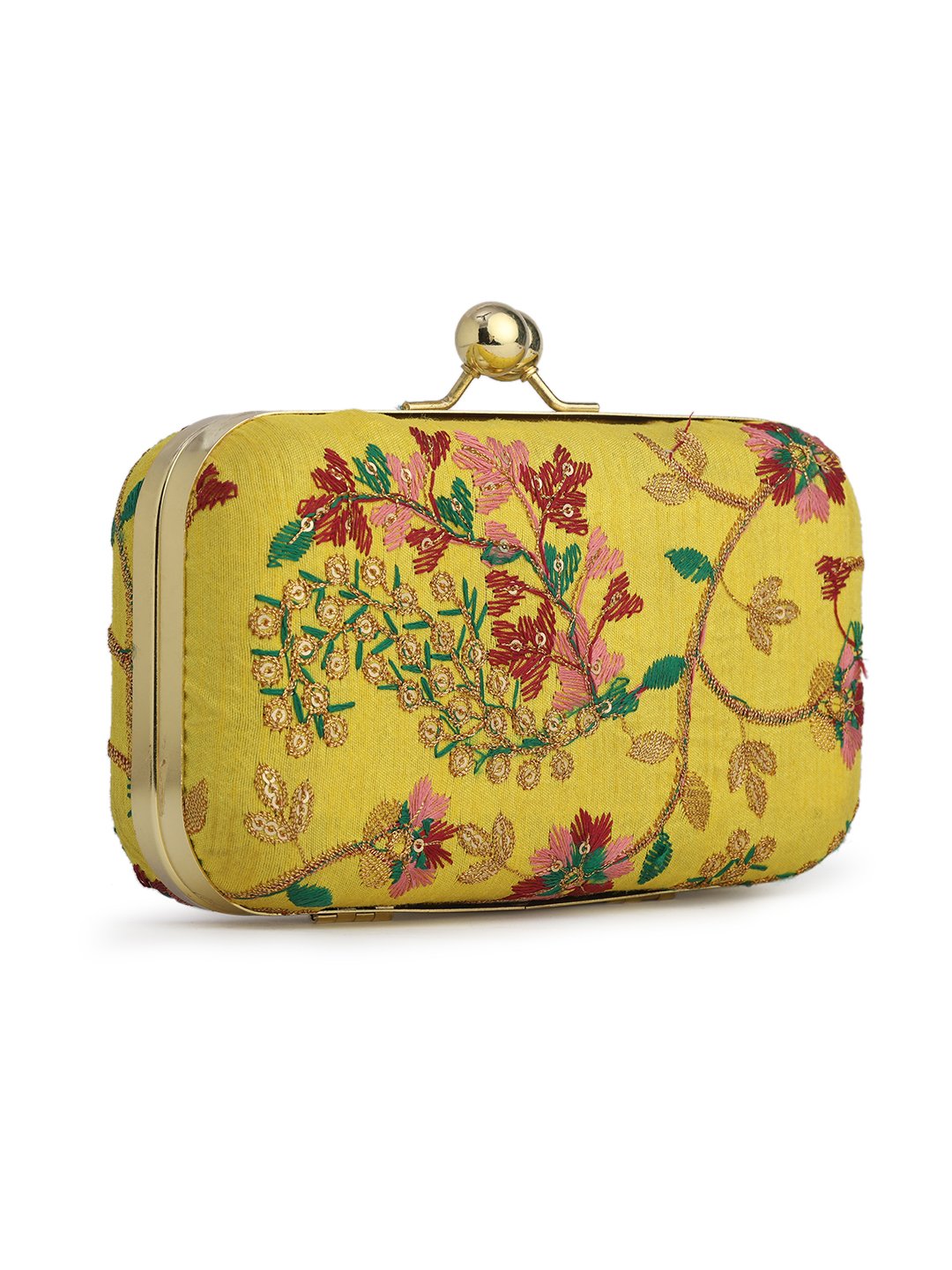 Yellow & Pink Embroidered Box clutches, Has gold chain shoulder strap, 1 main compartment with twist closure